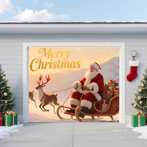 TTCHANG Christmas Garage Door Banner Cover – Santa Claus Sleigh & Reindeer Outdoor Holiday Mural, Large Waterproof Reusable Xmas Garage Decoration Backdrop for Party Décor, 8 x 7ft/2.4 x 2.1m