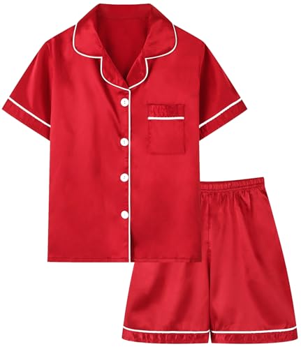 Satin Pajamas for Boys, 2 Pcs Sleepwear Short Sleeve Silk Satain Pajama Loungewear for Kids, Red, 9-10 Years = Tag 150