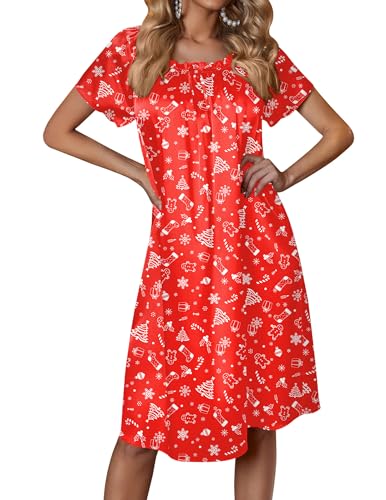 Ekouaer Women's Satin Silk Pleated Nightgown Loose Sleepwear Printed Nightshirt Short Sleeve Sleep Dress