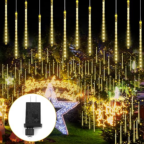 TECHMUR Meteors Shower Lights, 192 LED Falling Rain Lights 8 Tubes 11.8 Inch Waterproof Christmas Plug in Snowfall LED Outdoor for Tree Party Garden Yard Holiday Christmas Decoration, Warm