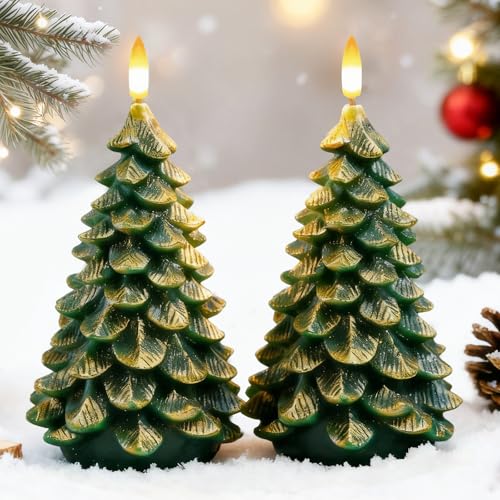 Qmioti Christmas Tree Candles with Remote Timer, 2 Pack Waxy Flameless Christmas Tree Candle, Green Tree Candles Battery Operated for Christmas Decoration & Gifts