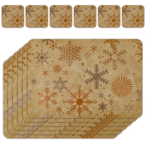 Le courant 16.9in 6PACK Christmas Snowflake Placemats with 6 Coasters, Reversible Faux Leather Easy Clean Waterproof Stain Resistant Place Mats, for Home Party Dining Holiday Table Decor