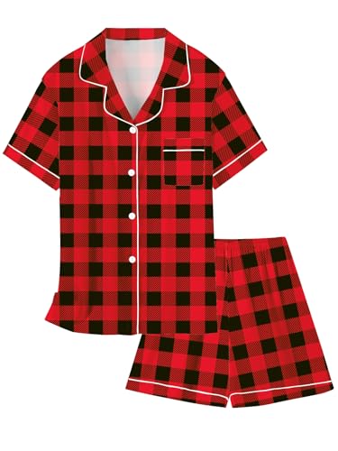 Christmas Satin Pajamas Set for Girls Silk Button-up Sleepwear Loungewear Pjs,Red Black Plaid, 5-6 Years