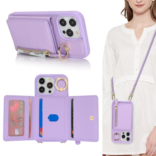 SunYoo for iPhone 13 Pro Case with Card Holder,for iPhone 13 Pro Wallet Case for Women with Strap Crossbody Lanyard Stand Ring,PU Leather Zipper Pocket Phone Cover-Purple