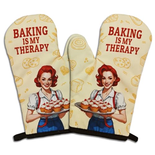 GOSJINNK 2 Pcs Funny Baking Oven Mitts Baking is My Therapy Heat Resistant Mitts Housewife Silicone Non-Slip Oven Mitts with Hanging Loop Kitchen Decor Gifts for Women Bake Lover Friend Hostess Chef