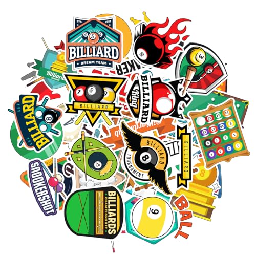 BETANAS 50 PCS Pool Billiard Stickers Pack, Vinyl Waterproof Decals of 8 Ball Cues Tables Racks Funny Billiards Designs, Gift for Kids Teens Adults Laptop Water Bottle Skateboard Car Luggage
