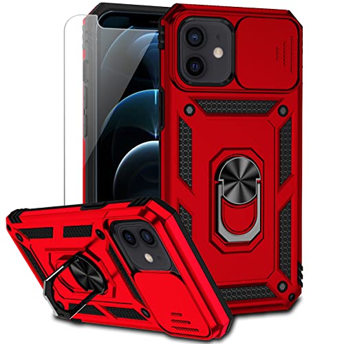 M MAIKEZI for iPhone 12 / iPhone 12 Pro Case with Camera Lens Cover HD Screen Protector, Military Grade Drop Protection Magnetic Ring Holder Kickstand Protective Phone Case for iPhone 12/12 Pro (Red)