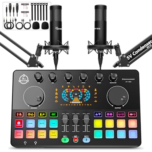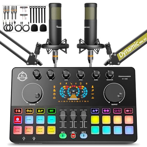 Podcast Equipment Bundle for 2, Audio Mixer with XLR Dynamic Microphone, Voice Change,RGB for Vocal Recording Podcasting,Streaming Singing TikTok, PC, Smartphone COMMANDER M100 3rd