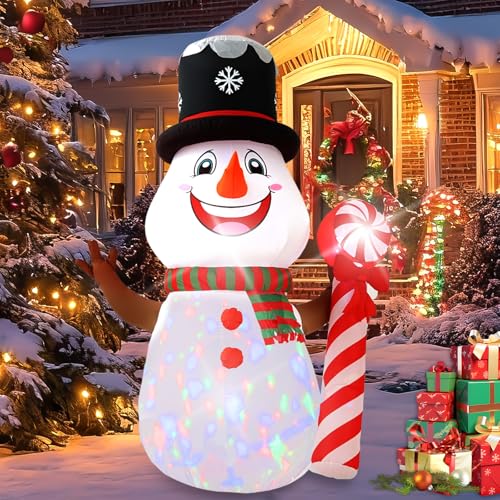 InfleasJoiy 8FT Candy Cane Snowman Christmas Decoration with Built-in LED Lights and Colorful Rotating Lights, Christmas Outdoor Inflatable Decoration for Lawns, Yards, Gardens, and Patios