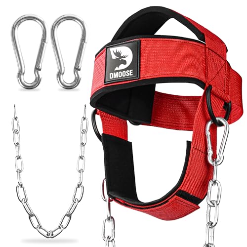 DMoose Fitness Neck Harness for Weight Lifting - Soft Padded Head & Chin Strap with 30" Heavy Duty Steel Chain - Neck Exerciser, Trainer & Strengthener to Support Injury Recovery (Red)