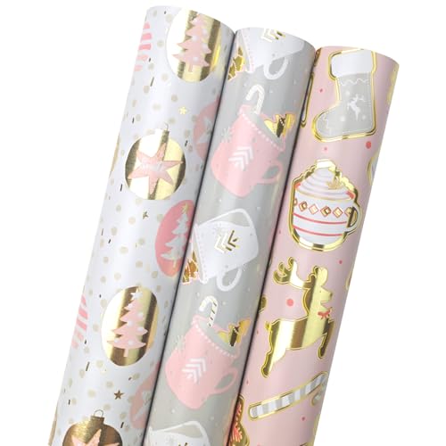 LDGOOAEL Mini Christmas Wrapping Paper Rolls (17"x120") - Easy-Tear Cut Lines on Back, Festive Pink & Grey Gingerbread Man Holidays Tree Metallic Shine for Small/Medium Gifts, Xmas Party