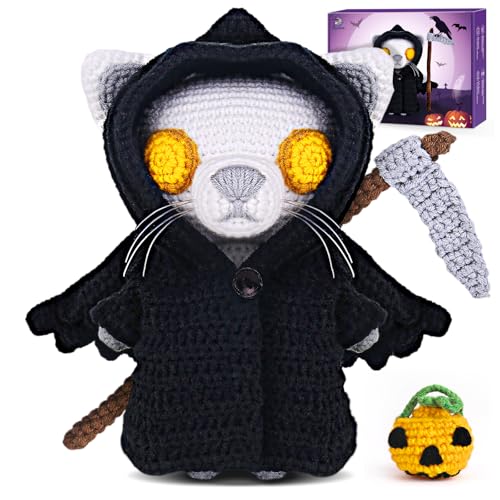 Crochet Kit for Beginners, Crochet Starter Kit with Step-by-Step Video Tutorials, Crochet Animal Kits for Adults, DIY Craft Supplies,Death Cat(40%+ Yarn)
