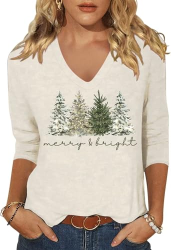 FKQRXO Women's V-Neck 3/4 Sleeve Merry Christmas T-Shirt Winter Christmastree Snowman Xmas Family Party Graphic Tees Tops(924-Beige-2,M)
