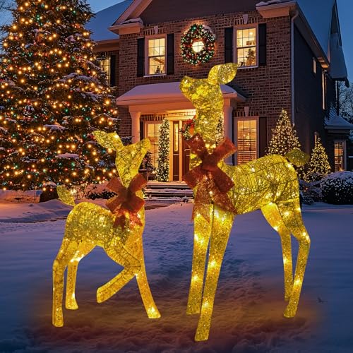 Christmas Decorations 38-inch Christmas Reindeer Decor Set Includes Two Reindeer: a Champagne Gold Female Deer and a Fawn with a Bow. Perfect for Outdoor Lawn displays and Holiday Arrangements.