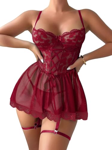 Lilosy Plus Size Curvy Sexy Garter Belt Mesh Lace Babydoll Lingerie Dress Set with Thong Women Floral NightDress Nightwear Cute Underwire Push Up Corset Outfit Sheer Slip Burgundy Red 4X-Large