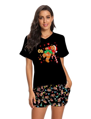 RAISEVERN Christmas Pajamas for Women Gingerbread Man 2 Piece Pjs V Neck Short Sleeve Ugly Xmas Pajama Set Tops Shorts with Pocket Sleepwear Nightwear