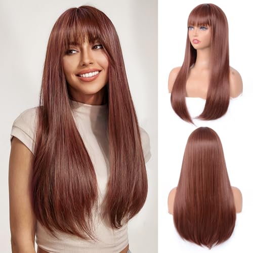 Aida ble Brown Wig With Bangs Long Straight Brown Wig for Women Heat Resistant Synthetic Wig for Girls Daily Use Party Halloween Cosplay Wig 24inch