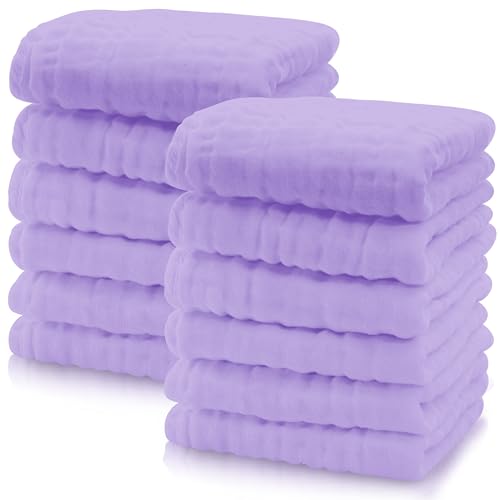 Cute Castle 12 Pack Muslin Baby Washcloths - Large 12'' by 12'' - Ultra Soft 100% Cotton - Super Absorbent Burp Cloths for Unisex, Boy, Girl -Purple