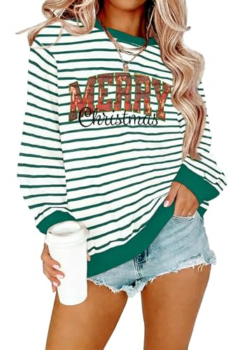 VILOVE Christmas Sweatshirts for Women Glitter Patch Merry Christmas Letter Print Sweater Embroidered Striped Pullover Tops