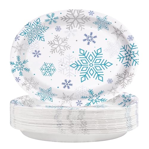 50 Pcs Christmas Snowflake Oval Paper Plates 10" x 12" Large Disposable 400 GSM Blue and White Winter Snow Paper Plates Frozen Wonderland Party Decorations for Winter Holiday Birthday Party Supplies