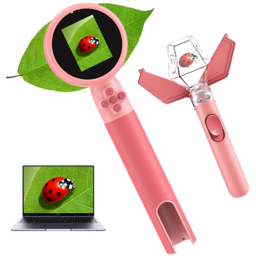 Kids Microscope with Bug Catcher Kit, 1080P Digital Mini Handheld Microscope STEM Science Toy with LED Light, Rechargeable, Portable, Supports 64GB TF Card, Educational Gift for Kids Ages 3-12 (Pink)