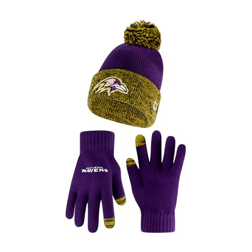 Ultra Game NFL Official Youth Super Soft Two Tone Winter Beanie Knit Hat with Extra Warm Touch Screen Gloves, Baltimore Ravens, Team Color, 1SIZE