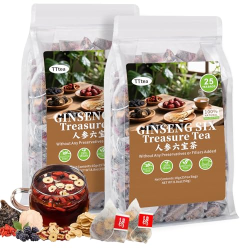 2 Pack Formula Ginseng Six Treasure Teal: 50 Bags Natural Kidney Cleanse Detox Herbal Tea for Men Women, Organic Blend with Ginseng Goji Red Dates Mulberry and Maca Caffeine-Free Energy and Vitality Support