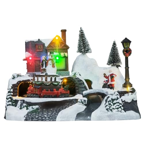 MerryPulse Christmas Village Houses - Colorful Animated Scenes with Rotating Train & Santa, Musical Christmas Village Train Collectible Building for Xmas Indoor Decoration