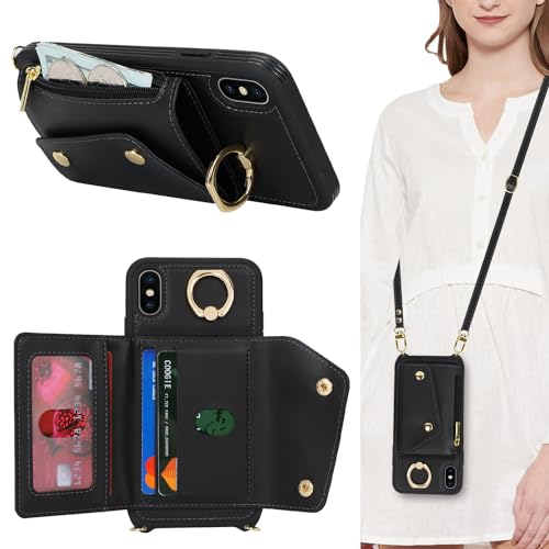 Lipvina for iPhone Xs Max Case with Card Holder and Strap - Zipper Pocket,Crossbody Lanyard Strap,Credit Card Holder,Stand Ring,Cute Phone Wallet Case for Women(Black,6.5 Inch)