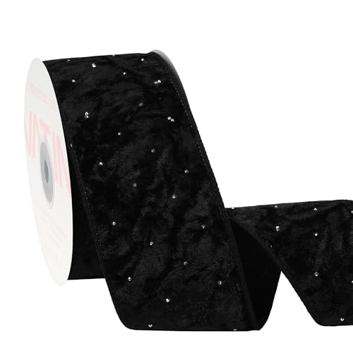 VATIN Black Velvet Ribbon with Rhinestones, 2-1/2-Inch x 10 Yards, with Standard Serged Edges, Luxury Christmas Gift Wrap Ribbon for Decorations, Gift Wrapping