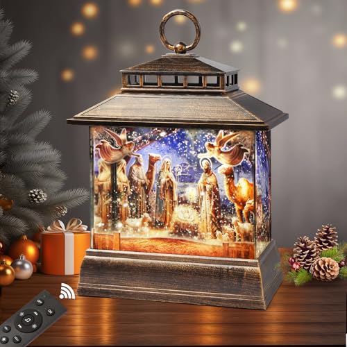 Christmas Snow Globe Lantern Water Glittering Lantern with 8 Songs & 6H Timer Romote Control Christmas Snow Globes USB & Battery Operated for Christmas Festival Decorations Gifts (Nativity)