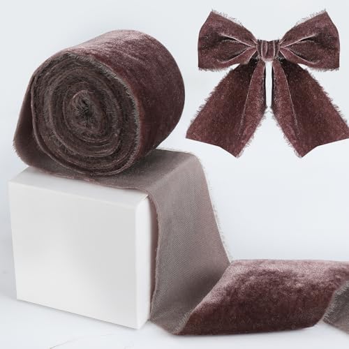 Wide Velvet Ribbon 3 Inch - Handmade Frayed Silk Velvet Ribbon Raw Edge, Vintage Fringe Fabric Ribbon for Christmas Home Decor Gift Wrapping Wreath Bow Bridal Bouquet DIY Crafts, 5Yard, Brown