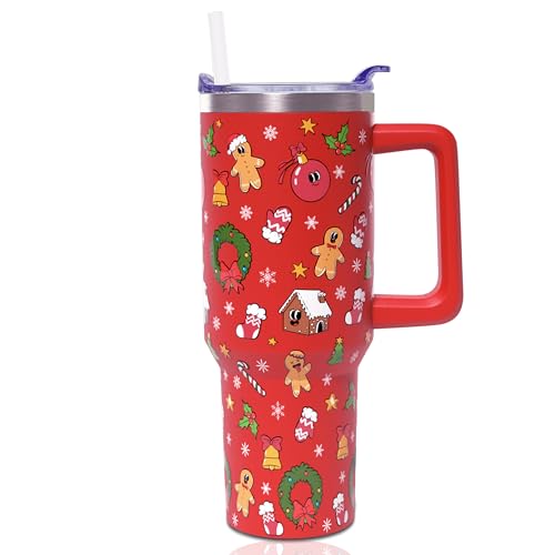 ZNYYZYBA 40 oz Christmas Tumbler with Handle and Straw, Stainless Steel Insulated Gingerbread Man Tumbler 40 oz, Reusable Gingerbread House Cup with Leak Proof Lid, Christmas Gifts for Women