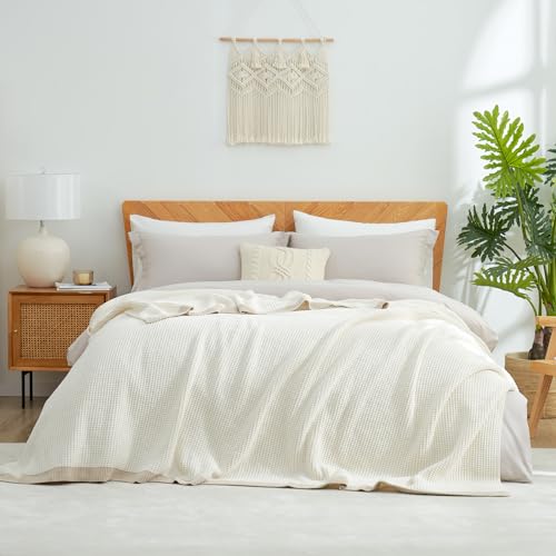 Amélie Home Waffle Blanket Queen Size for Bed, Soft Cozy Chenille Knit Blanket Warm Decorative for Bedroom, 90"x90", Ivory