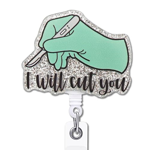 YAZMEEN Nurse Retractable Badge Reel with Alligator Clip I Will Cut You ID Card Badge Holder Surgical Tech Badge Funny Silver Glitter Badge Reel Gift for ICU ER EMT Surgeon Nurse Doctor Assistant
