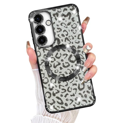 Fiyart Designed for Samsung Galaxy S25 Plus Case,Compatible with MagSafe Cheetah Print Plating Camera Protection Clear Magnetic Glitter Leopard Phone Bumper for Women Girls 6.7"-Black