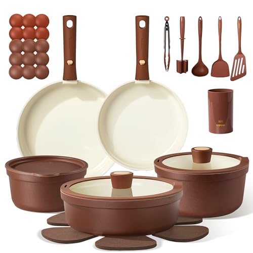 CAROTE 22Pcs Ceramic Cookware Set with Kitchen Essentials, Detachable Pots and Pans Set Non Stick, Non Toxic Oven/Dishwasher Safe, Induction Cooking, Gift Set, Includes Knife/Utensil Set