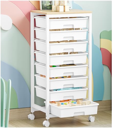 SYKIARIOL Rolling Cart with Drawers,8 Drawer Rolling Cart,Rolling Drawer Cart,Rolling Storage Drawer Cart,White Rolling Cart,Utility Cart with Drawers and Wooden Tabletop