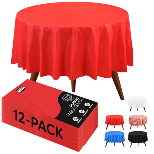 Utopia Kitchen Plastic Table Cloth Disposable (12 Pack - 84 Inch) Red Round Tablecloth Waterproof Stain Resistant Party Table Cover