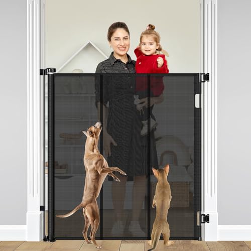 Reinforced 48 Inch Extra Tall Pet Gate with Support Rods - Bottom Anti-Escape, 4 Ft Tall Retractable Baby Gates for Doorways Mesh Dog Gate Indoor Outdoor - Prevent Baby/Pet from Jumping Over, Black