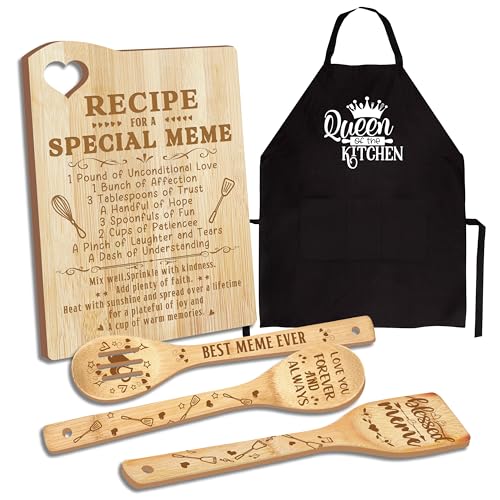 Christmas Meme Gifts, Gift for Meme for Grandma Wooden Cutting Board with Cooking Utensils Set with Apron from Grandkids Kitchen Set