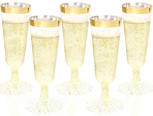 WDF Champagne Flutes, 36 Pack Gold Plastic - Glitter, Disposable Champagne Flutes for Party/Wedding/Thanksgiving, 6oz, BPA Free