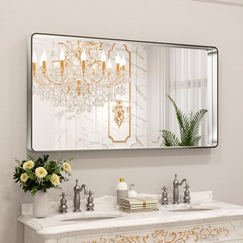 LOAAO 55X30 Inch Brushed Nickel Bathroom Mirror, Rounded Rectangle Silver Metal Frame Mirror, Brushed Nickel, Anti-Rust, Shatter Proof, Hangs Horizontally or Vertically
