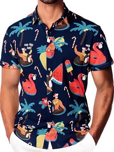 Damipow Christmas Hawaiian Shirts for Men Short Sleeve Santa Claus Party Tropical Aloha Shirt,Navy Santa,XXL