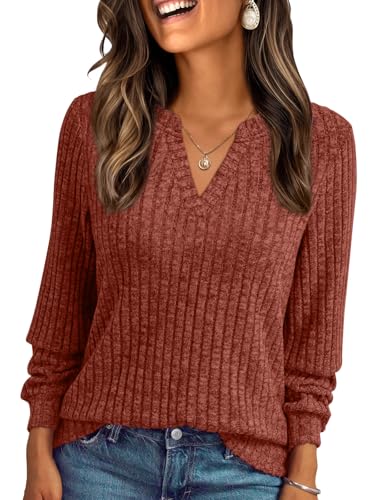 AUTOMET Womens V Neck Long Sleeve Shirts Casual Lightweight Tunic Sweaters Fall Fashion Tops Trendy Dressy Clothes 2025 Maple S