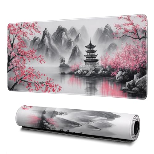 Retro Cherry Blossom Mouse Pad Abstract Big Mouse Pad 31.5x11.8 Inch Retro Texture Non-Slip Rubber Base Large Mousepad Stitched Edges Keyboard Mouse Mat Desk Pad for Office and Home
