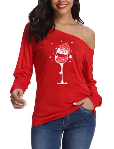 LYHNMW Women's Sexy Off Shoulder Long Sleeve Christmas Letter Print T-Shirt Tunic Tops Holiday Merry Xmas Hoodie