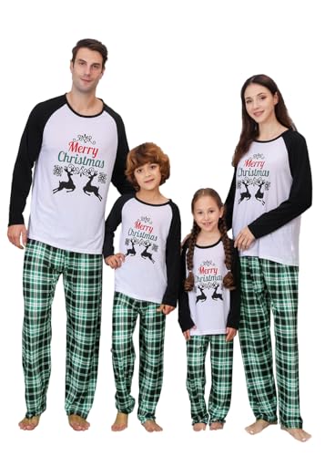 VNVNE Family Matching Christmas Pajamas, Holiday Cute Two Piece Xmas PJs Set Reindeer Long Sleeved with Green Plaid Long Pants Sleepwear(Youth,12-14Y)