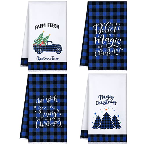 Patelai 4 Pack Christmas Kitchen Towels Buffalo Plaid Tea Dishtowels Farmhouse Winter Bathroom Hand Towels Christmas Decorations for Kitchen Holiday Xmas Housewarming Gifts(Blue Black,Tree)