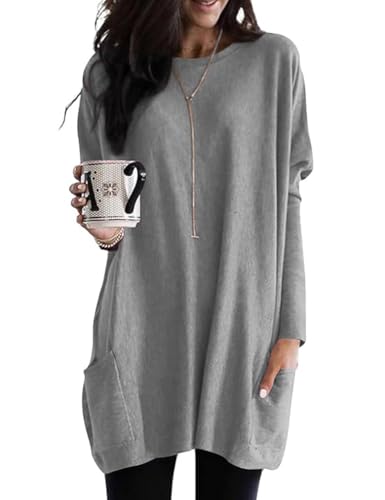 Poetsky Women's 2025 Casual Round Neck T-Shirt: Loose Fit, Long Sleeve, Solid Color, Long Tunic Top with Pockets;Light Grey,Small